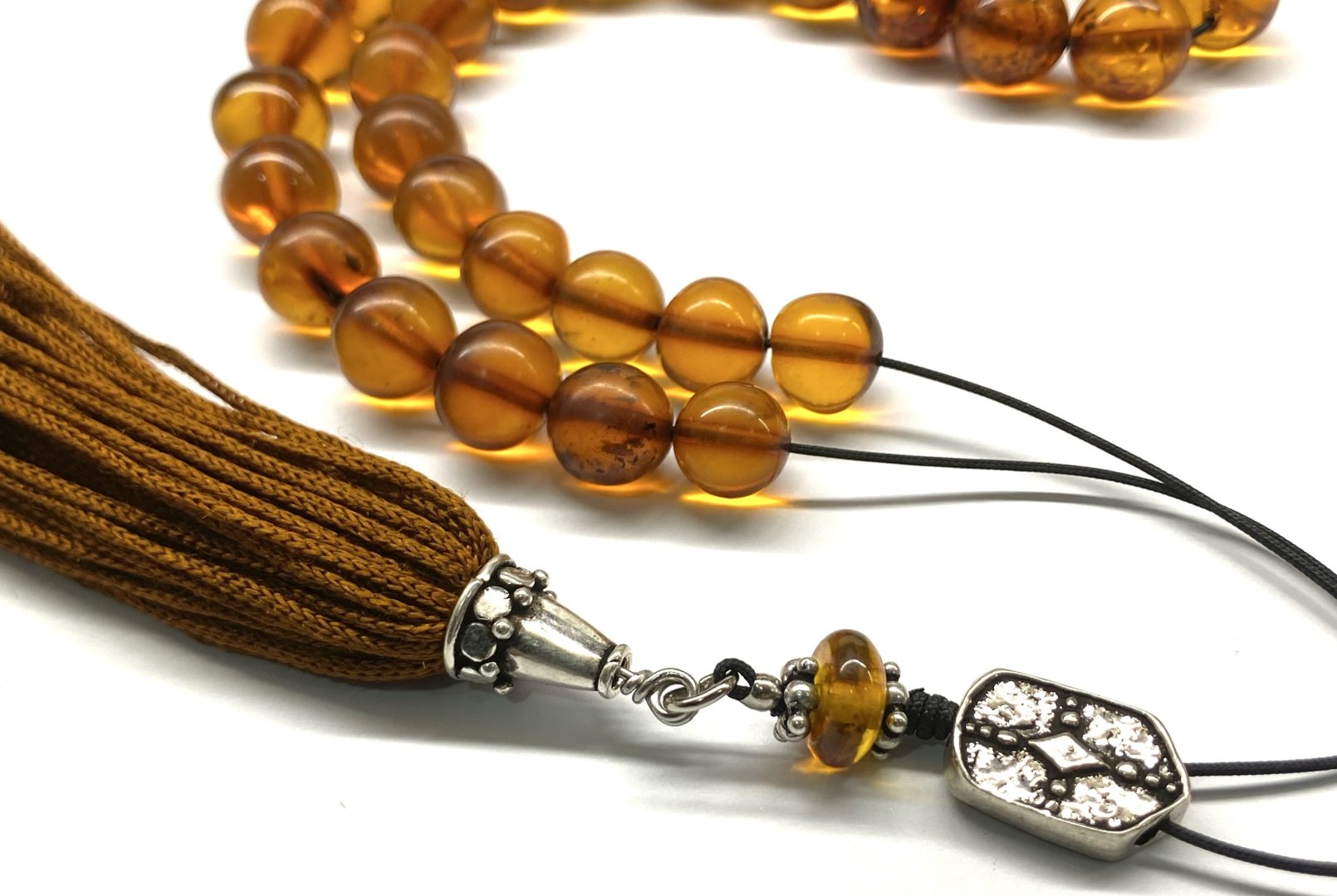 Δεμένο με 33 χάντρες, ασημένιο θυρεό και πλούσια φούντα στο τελείωμα .