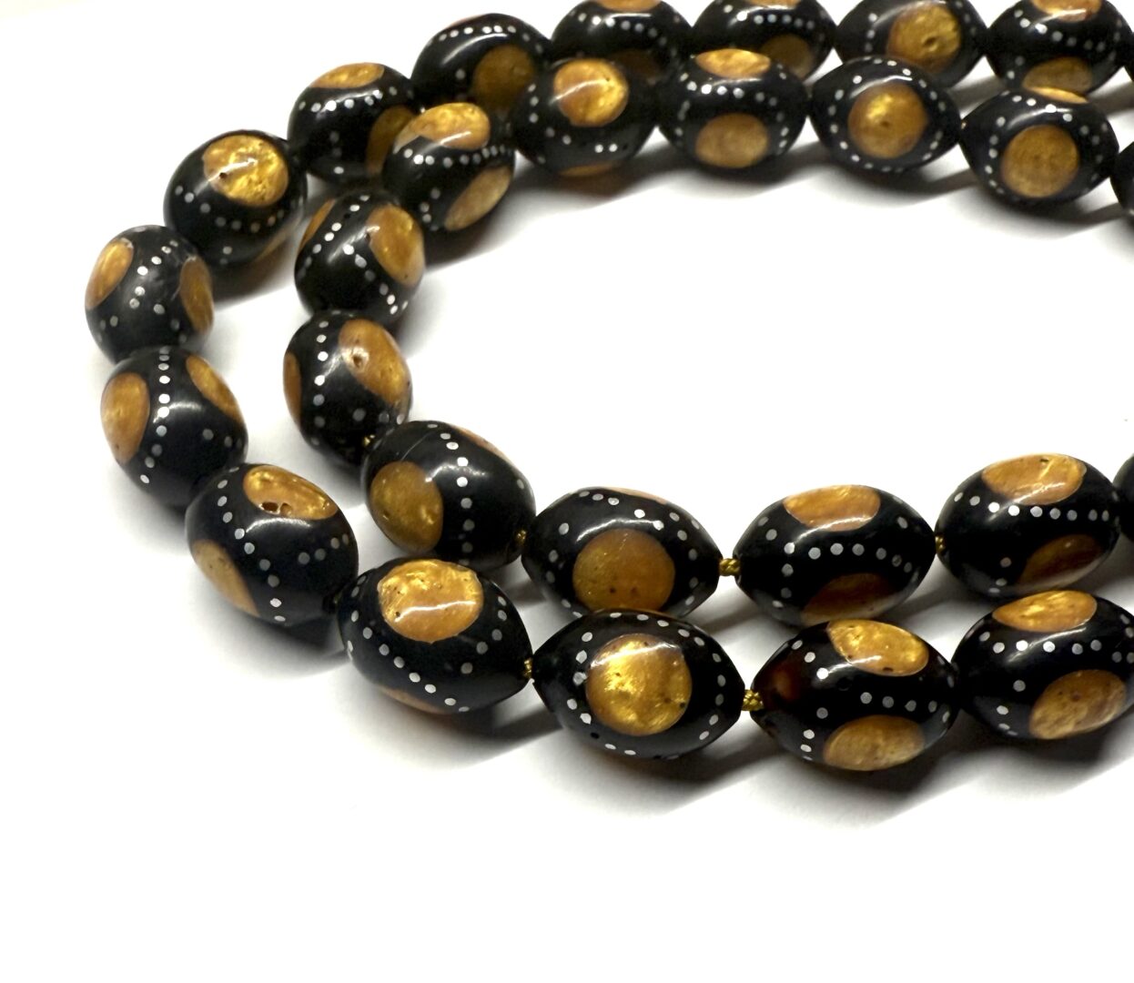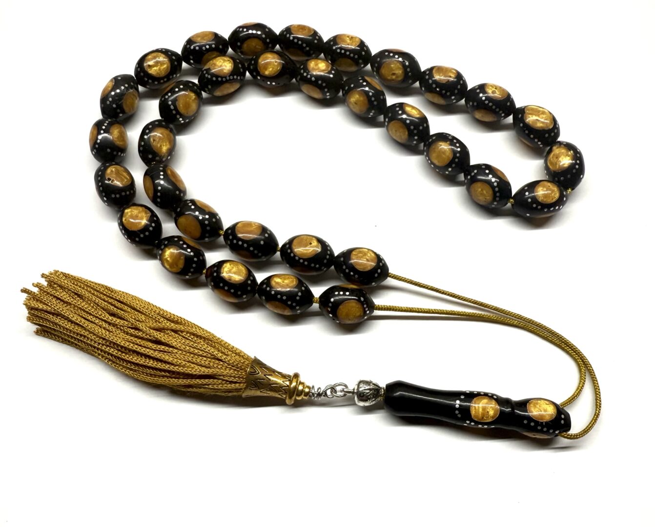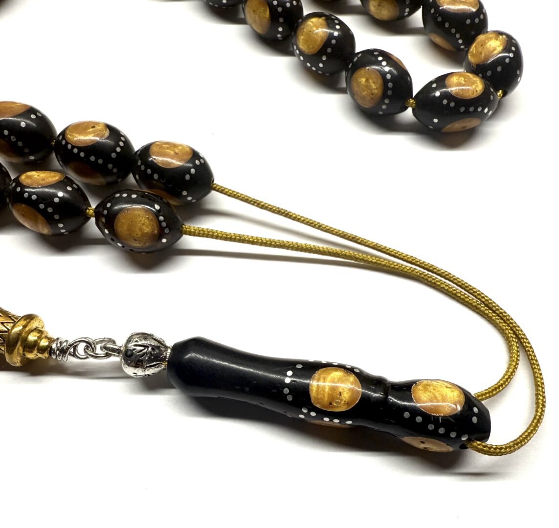 Χειροποίητο κομπολόι 33άρι από ξύλο Έβενου σε σχήμα ελιά, κεντημένο με Ασήμι και ένθετα από πάστα στο χρώμα του κεχριμπαριού σε κάθε χάντρα.