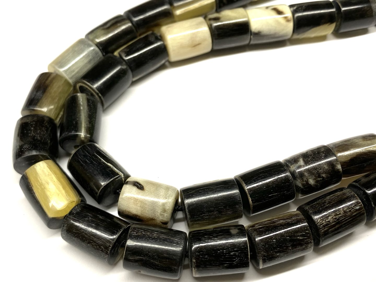 Το κέρατο από διάφορα ζώα όπως γιάκ, βουβαλιού, κατσίκας, ταύρου και ελαφιού είναι ένα ζεστό υλικό για την κατασκευή κομπολογιού. Τα χρώματα ποικίλουν με φυσικά πάντα νερά, ενώ στο παίξιμό του μας δίνει ένα βαθύ ήχο. Το κέρατο είναι ανθεκτικό σε χτυπήματα και τυχόν πτώσεις. Πολλοί πιστεύουν ότι οι χάντρες από κέρατο βούβαλου ή ταύρου δίνουν τύχη.