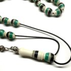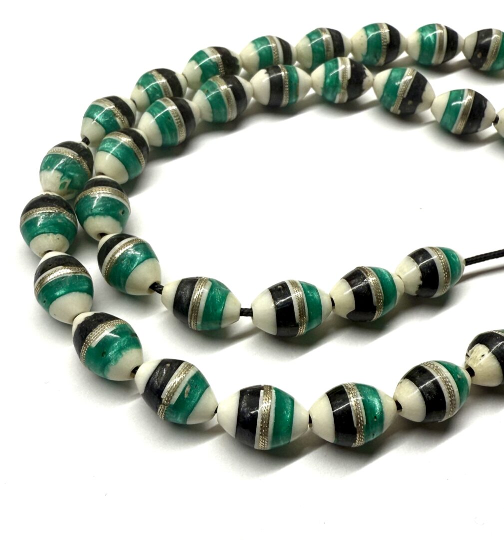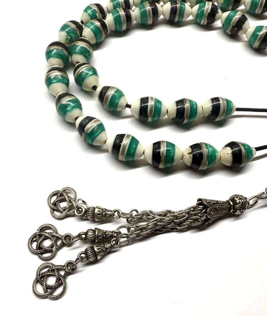 Χειροποίητο κομπολόι από κόκκαλο καμήλας σε σχήμα ελιά κεντημένο με ασήμι και στολισμένο με ένθετα από χρωματισμένη πάστα .