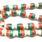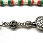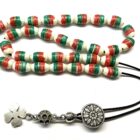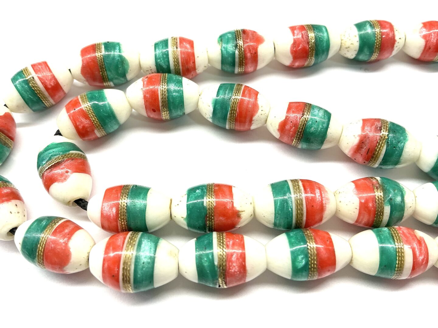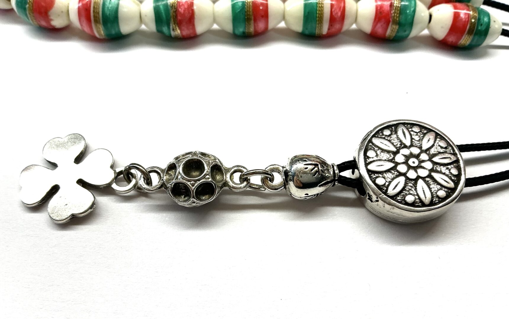 Χειροποίητο κομπολόι από κόκκαλο καμήλας σε σχήμα ελιά στολισμένο με ένθετα από κόκκινη και πράσινη πάστα και καρφωμένο μπρούτζο.