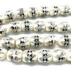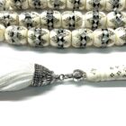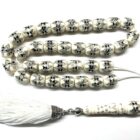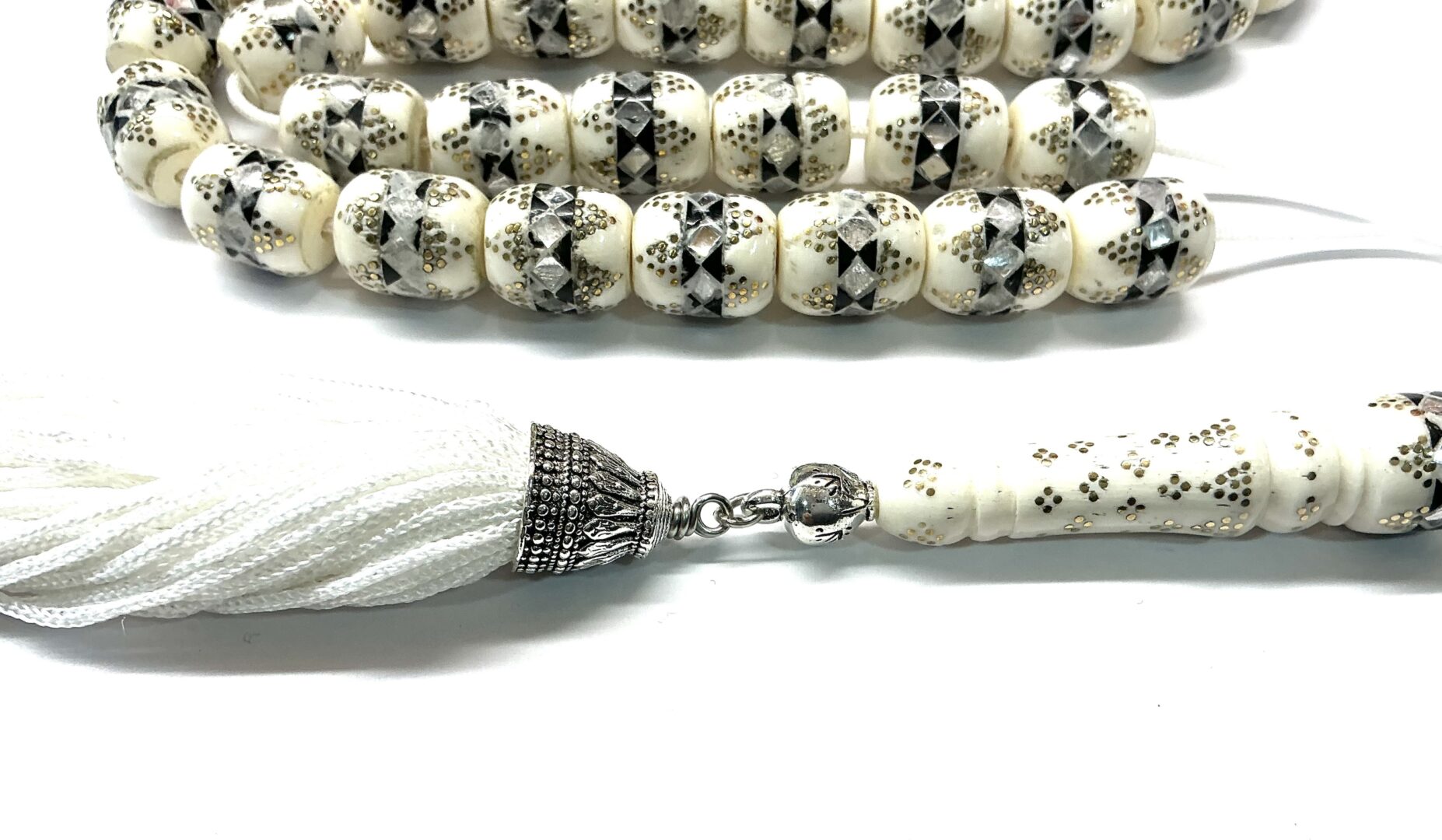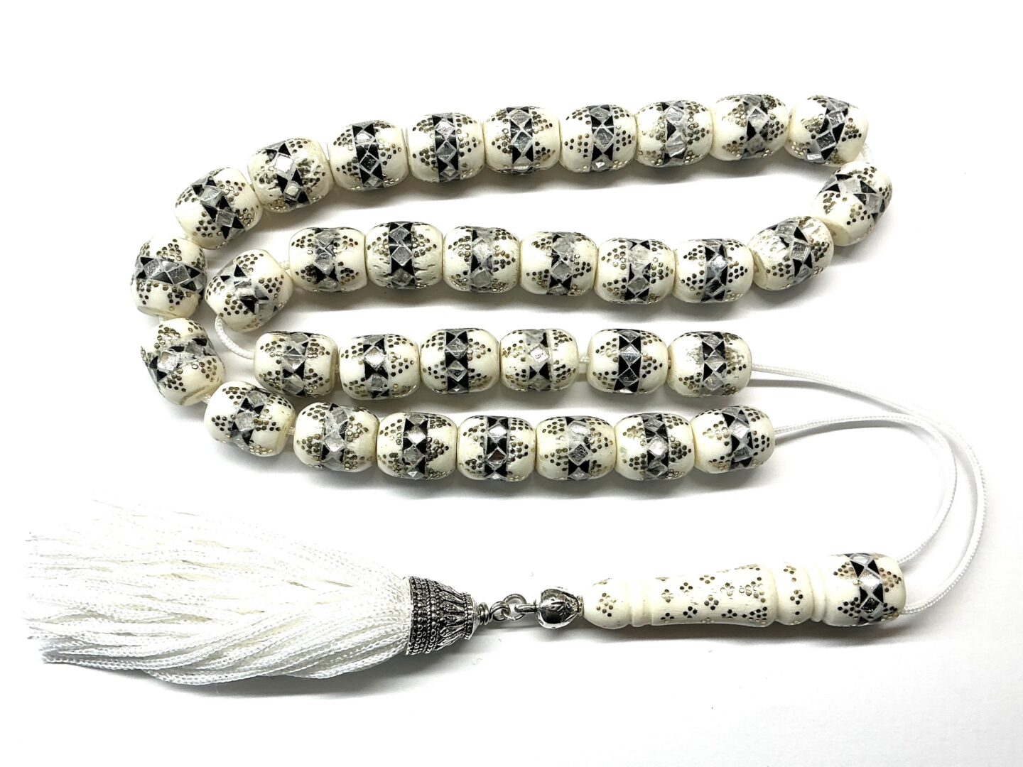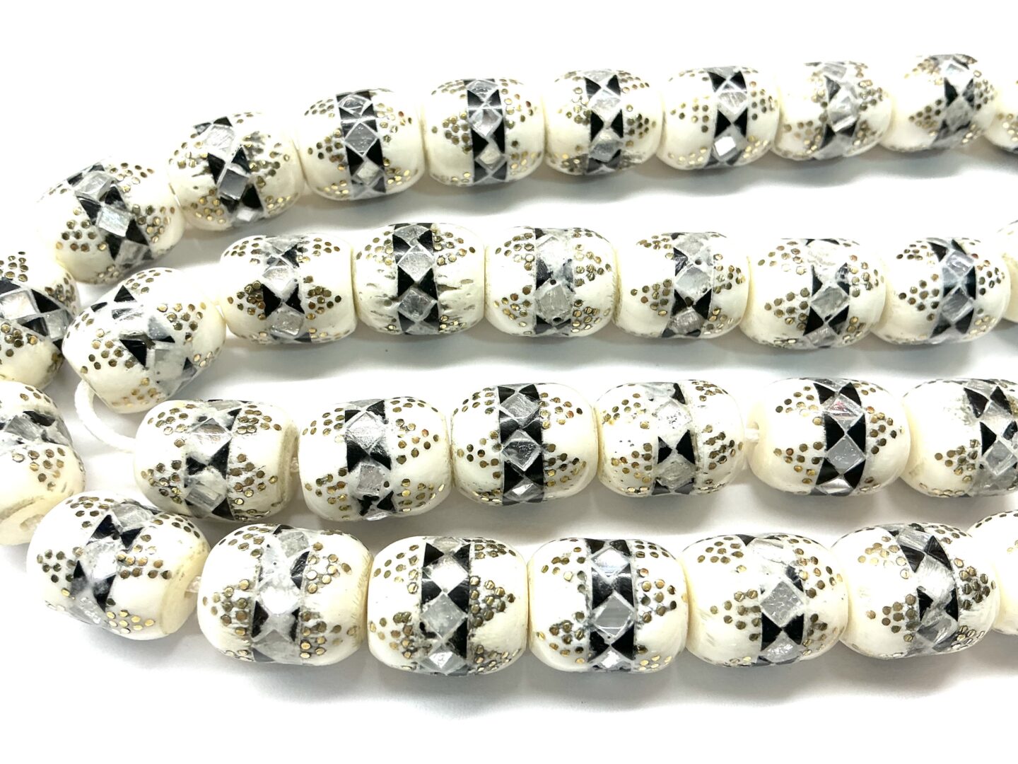 Χειροποίητο κομπολόι από κόκκαλο καμήλας σε σχήμα βαρελάκι στολισμένο με ένθετα από άσπρη και μαύρη πάστα και καρφωμένο μπρούτζο.