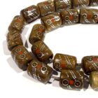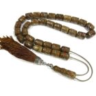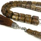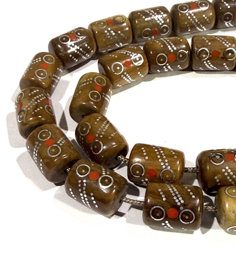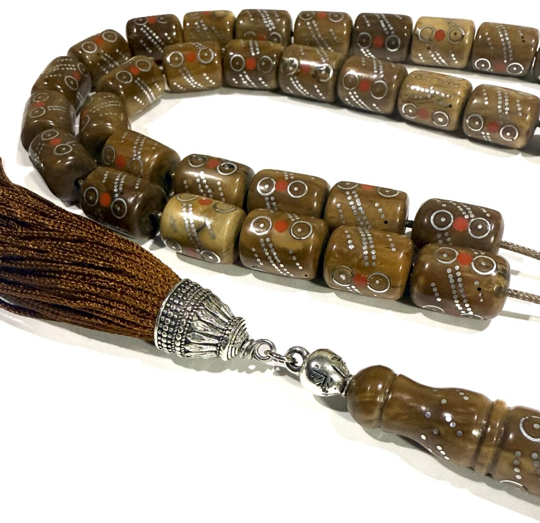 Χειροποίητο κομπολόι 33άρι από ξύλο φοινικόδεντρου Κούκ κεντημένο με ασήμι με ένθετα από χρωματισμένη πάστα σε σχήμα βαρελάκι