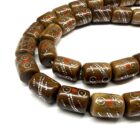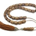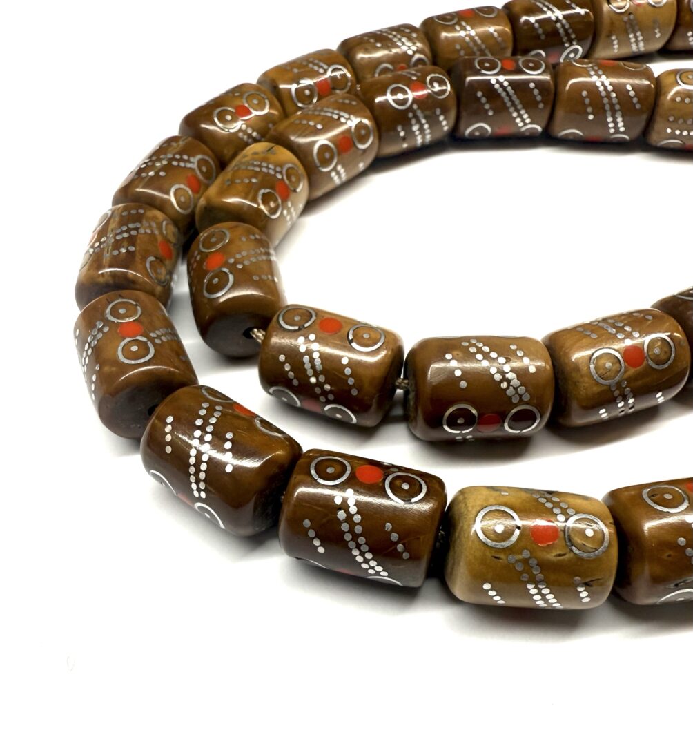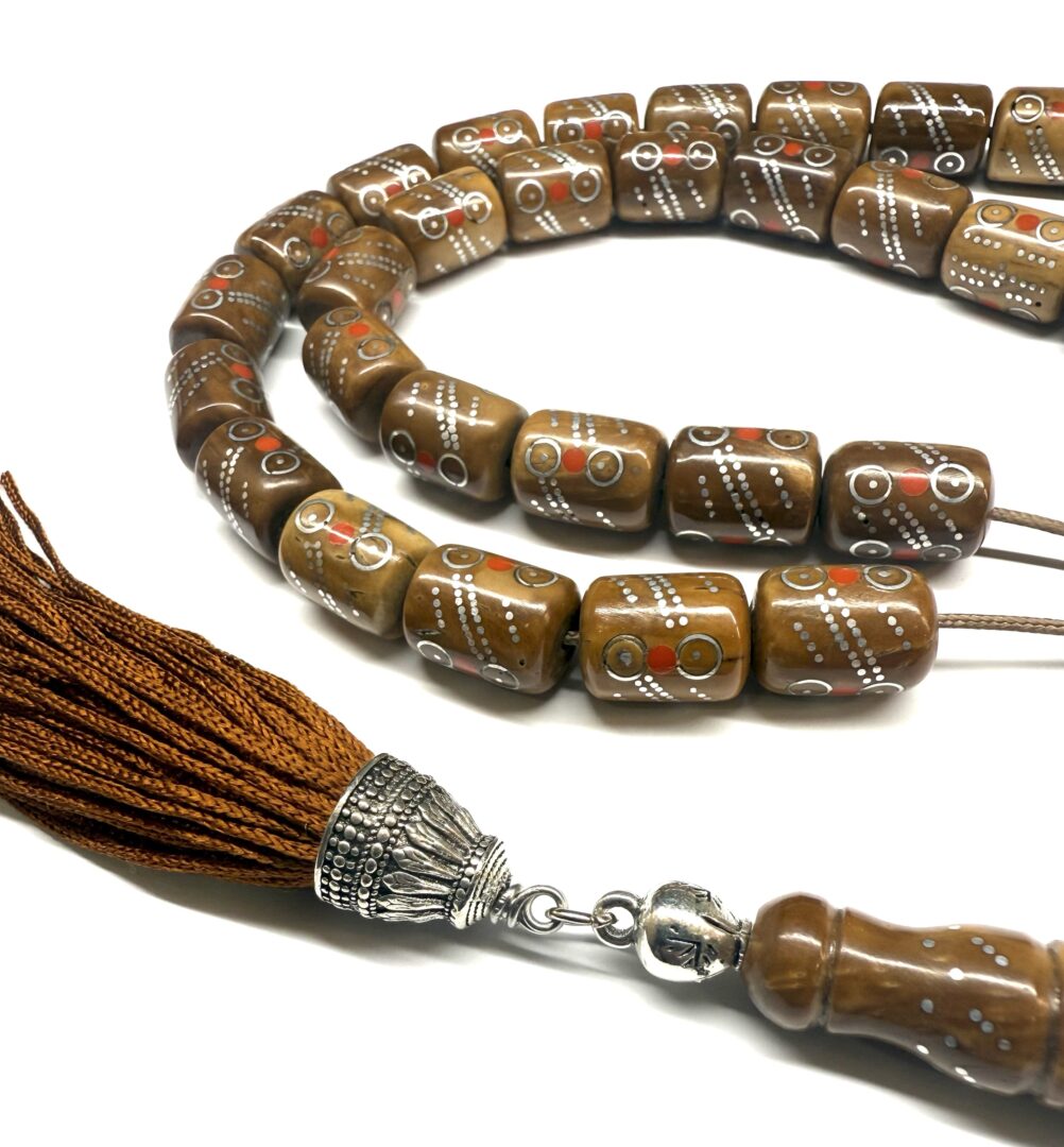 Χειροποίητο κομπολόι 33άρι από ξύλο φοινικόδεντρου Κούκ κεντημένο με ασήμι με ένθετα από χρωματισμένη πάστα σε σχήμα βαρελάκι