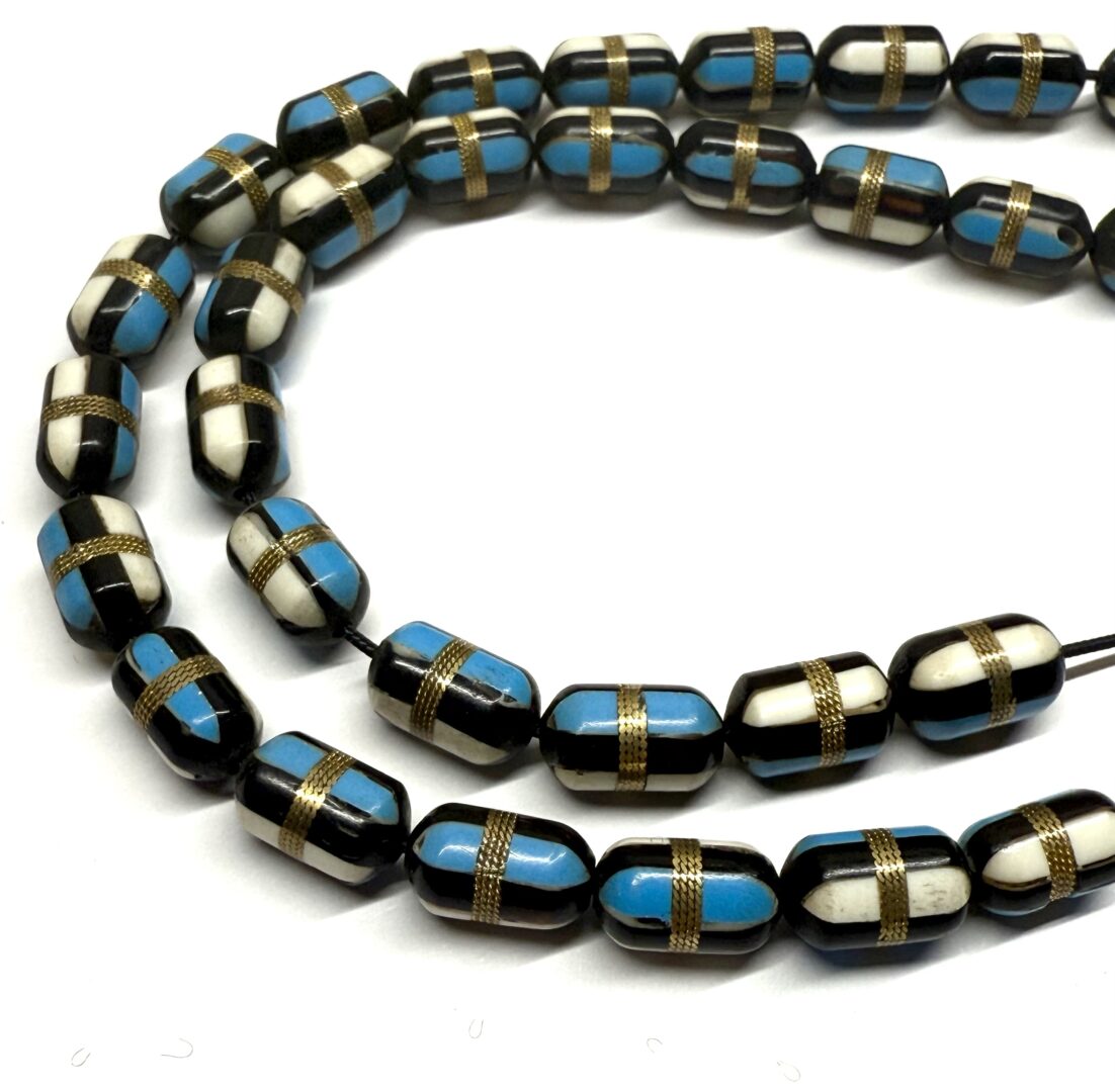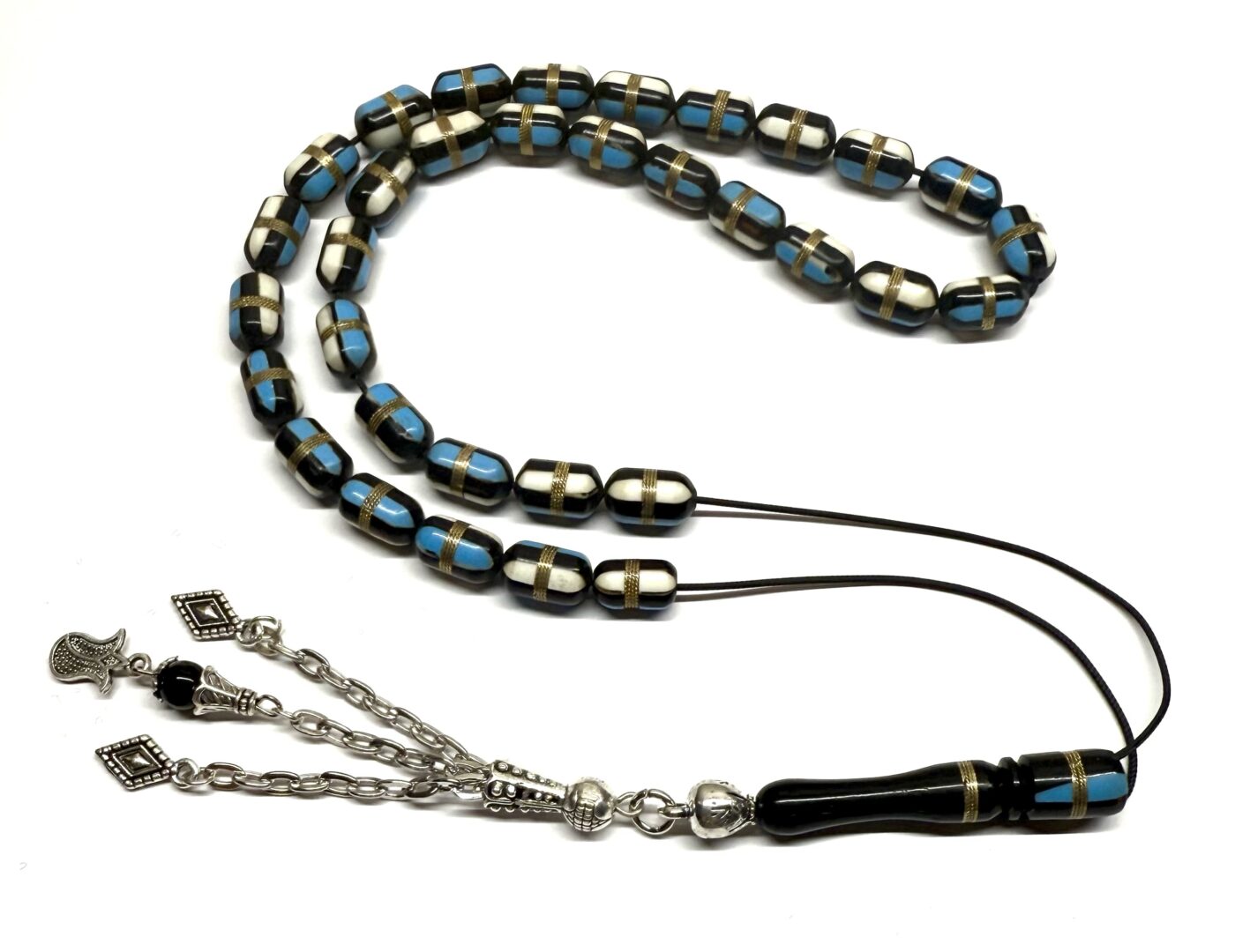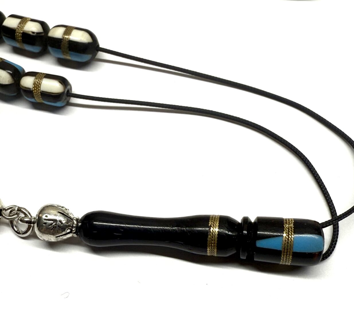 Χειροποίητο κομπολόι 33άρι από ξύλο φοινικόδεντρου Κούκ σκουρόχρωμο στολισμένο με μπρούντζο και ένθετα από λευκή πάστα και τυρκουάζ.