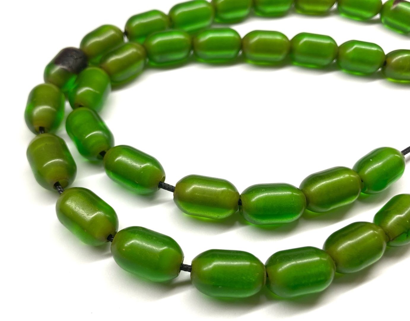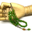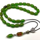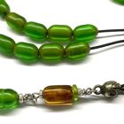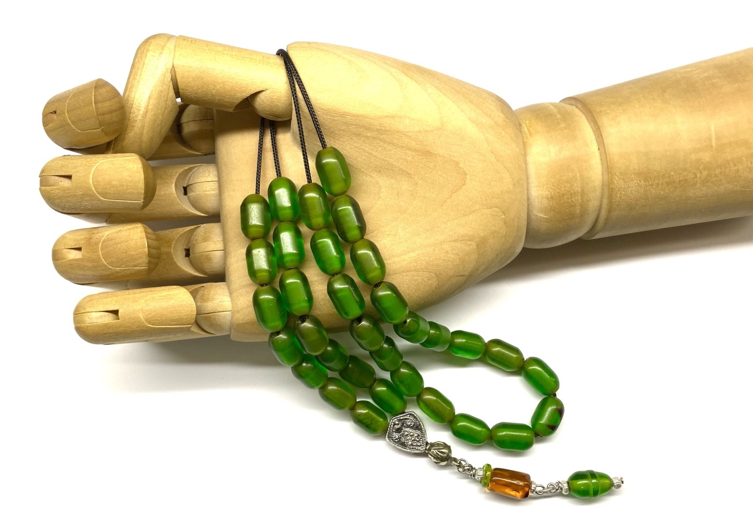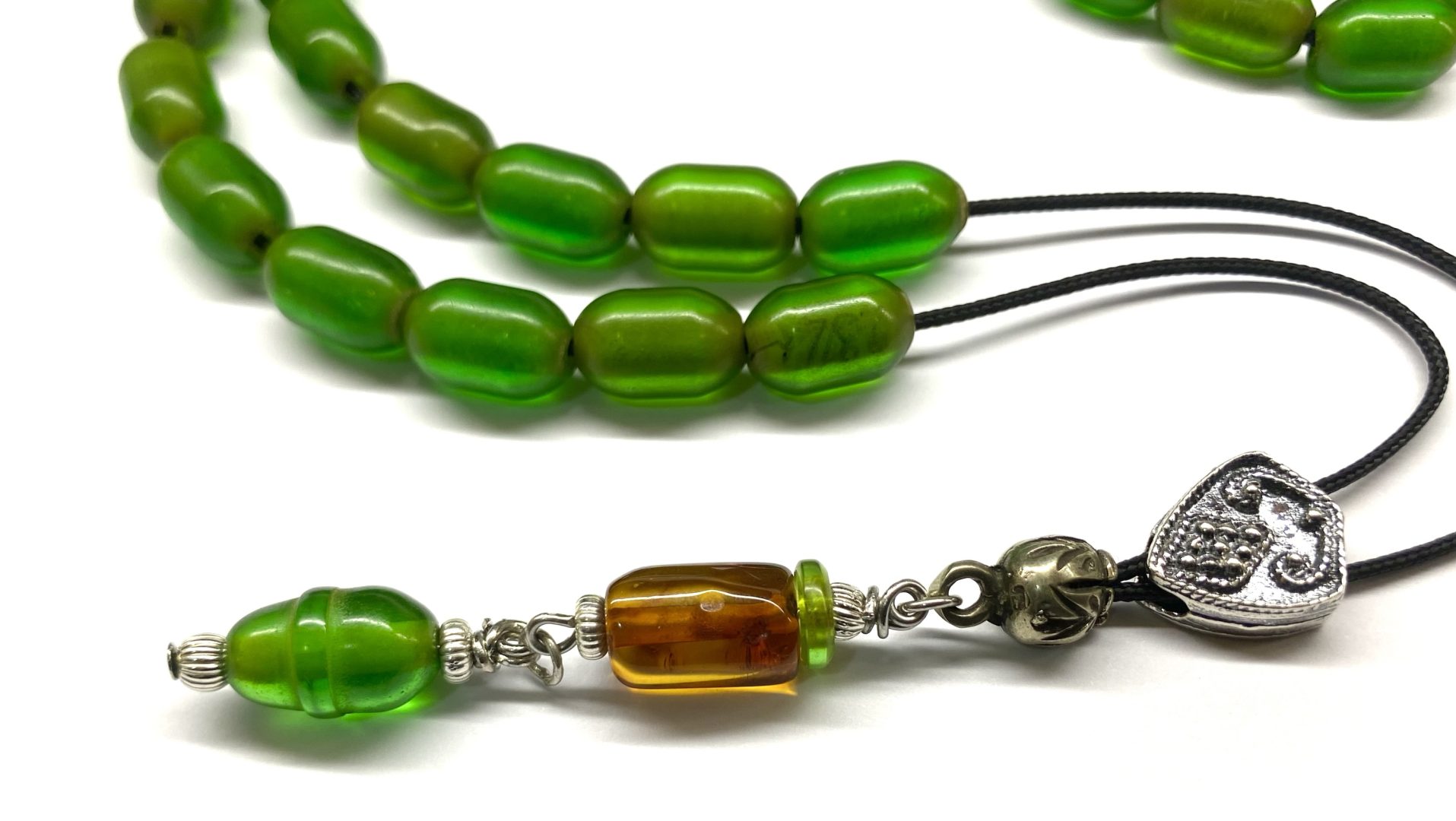 Χειροποίητο 33άρι σπάνιο κομπολόι από παλαιά Μαστίχα Αιγύπτου σε χρώμα πράσινο και στο τελείωμα του κομπολογιού 1 χάντρα από ατόφιο Κεχριμπάρι Βαλτικής κονιάκ.