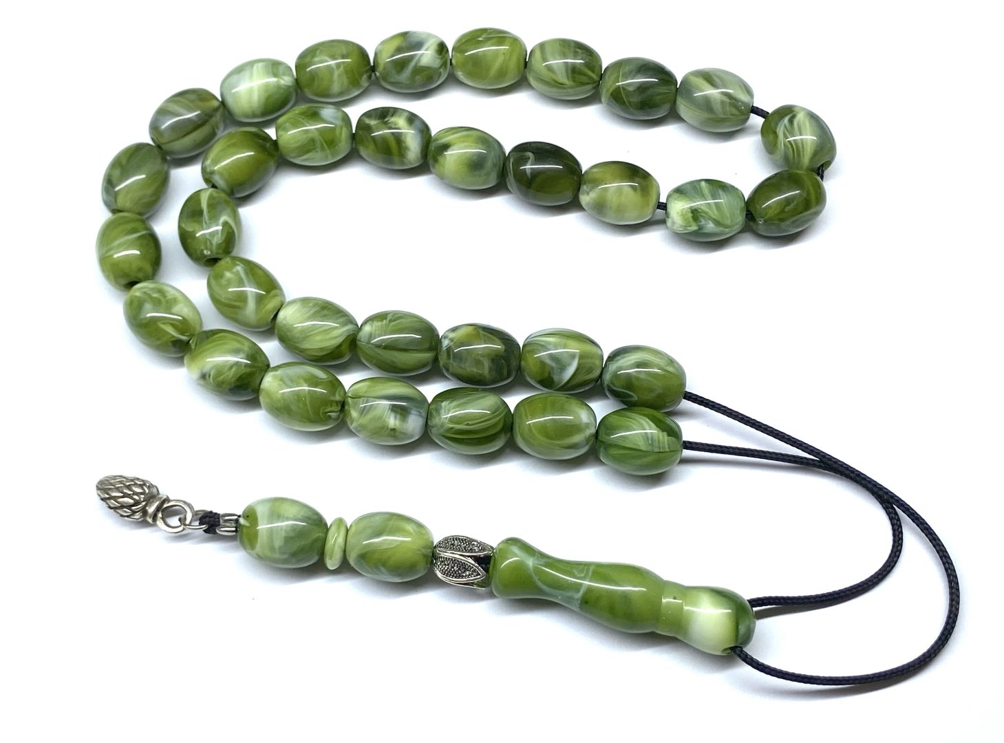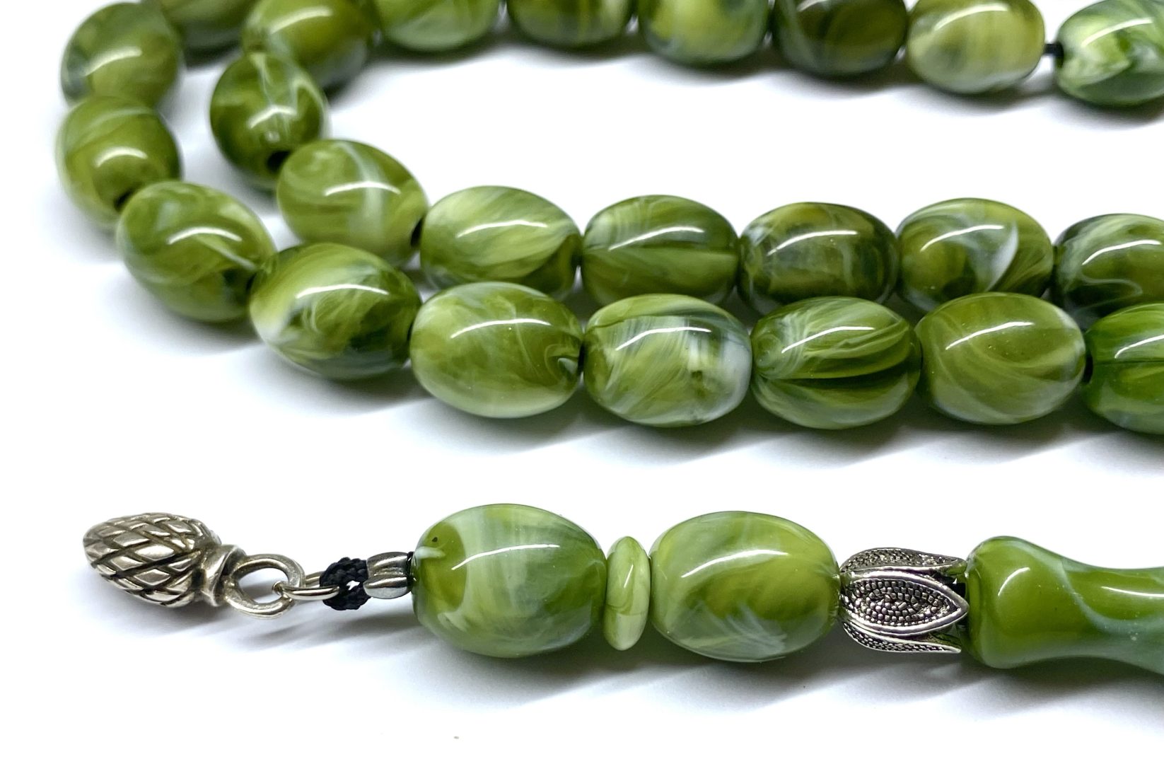 Χειροποίητο κομπολόι με 33 χάντρες από Ρητίνη πράσινη σε σχήμα ελιάς.