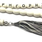 Δεμένο με 19 χάντρες, παπά και πλούσια φούντα στο τελείωμα.