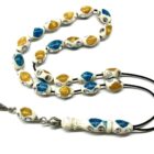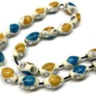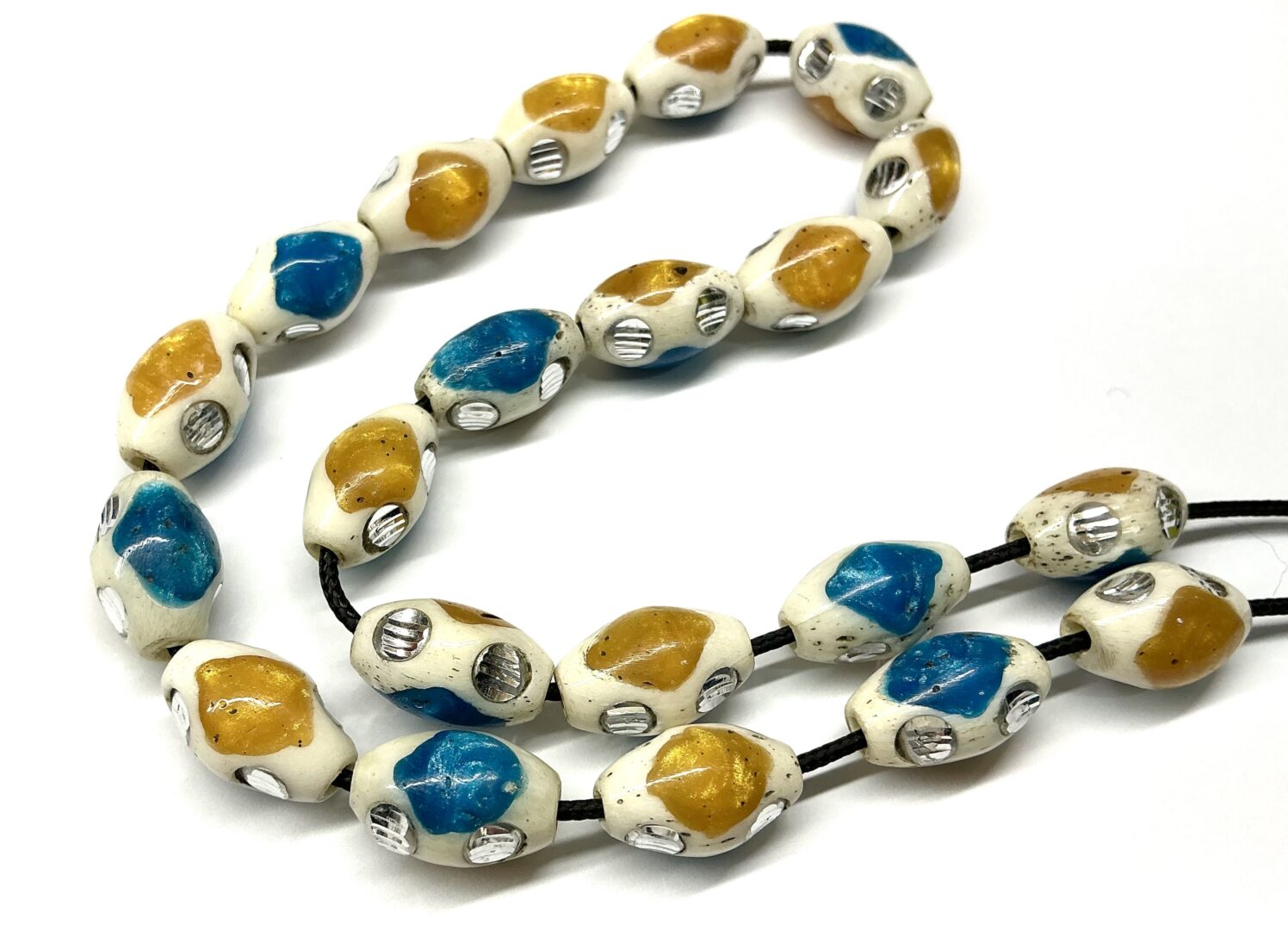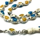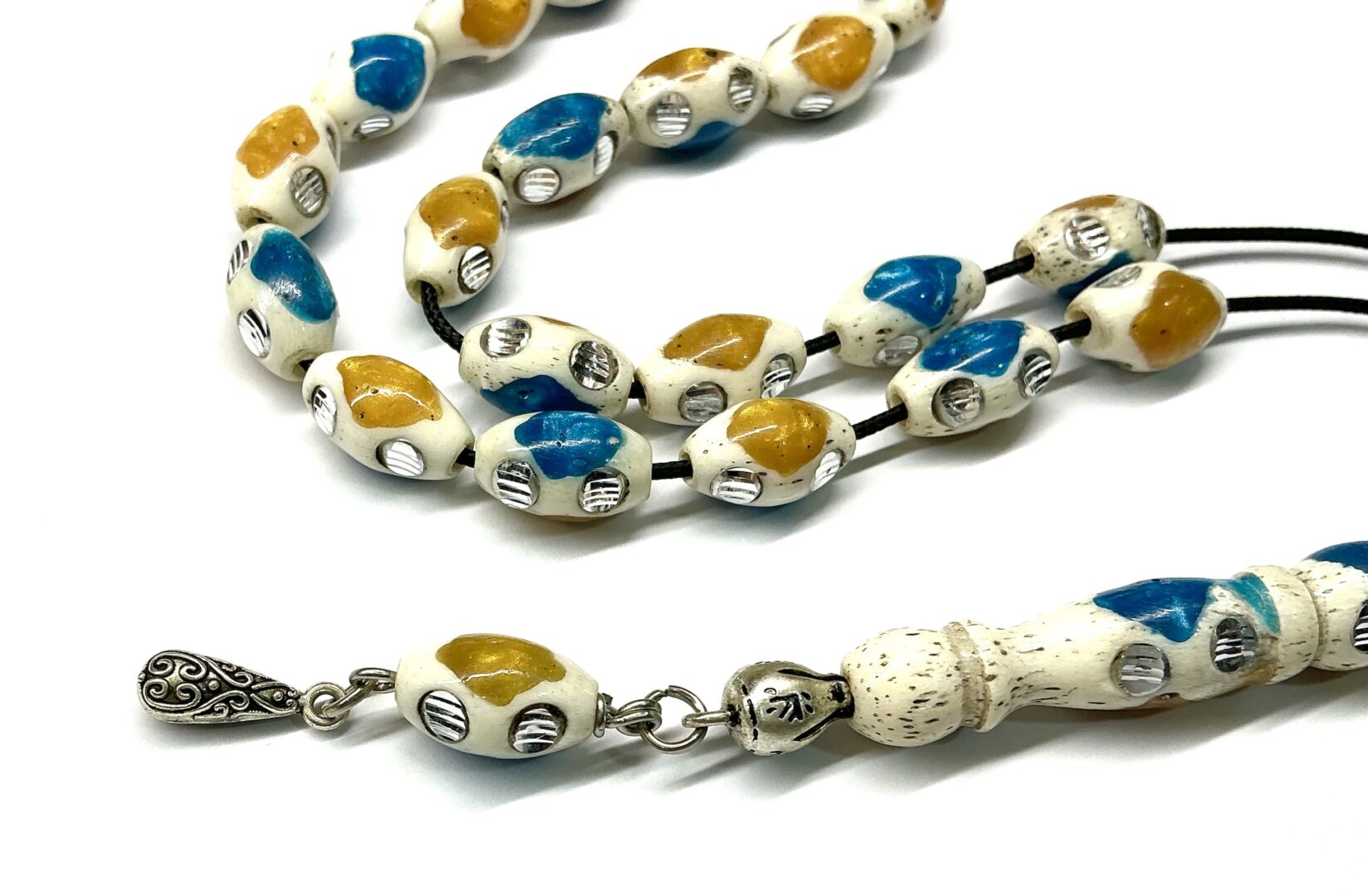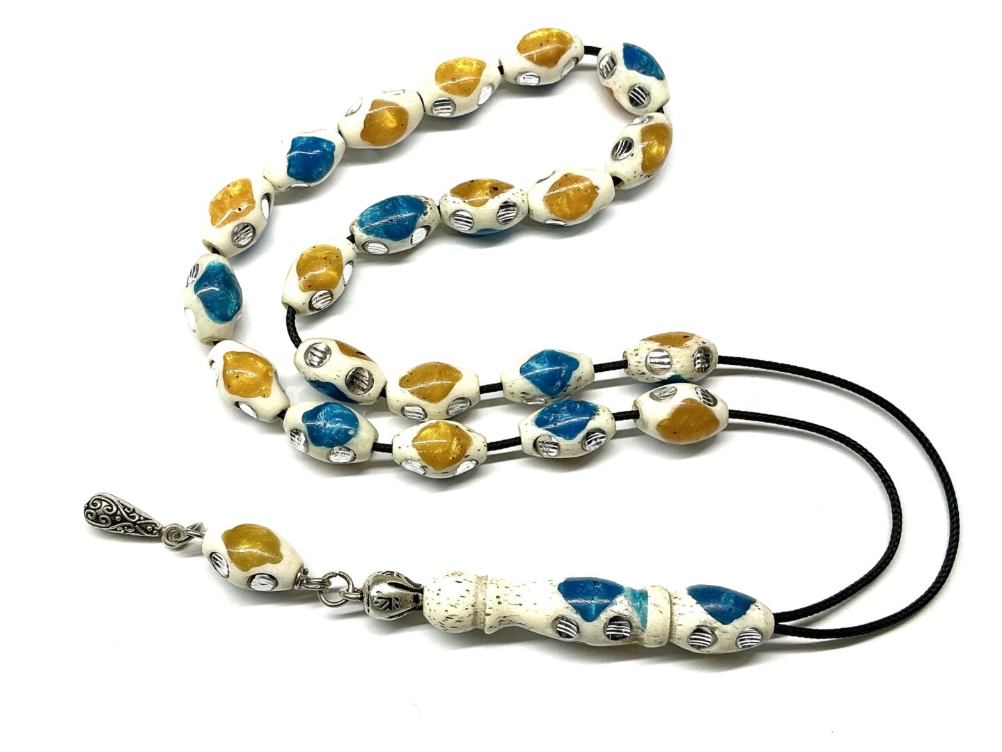 Χειροποίητο κομπολόι από κόκκαλο καμήλας σε σχήμα ελιά στολισμένο με ένθετα από πρεσαριστό κεχριμπάρι και τυρκουάζ.
