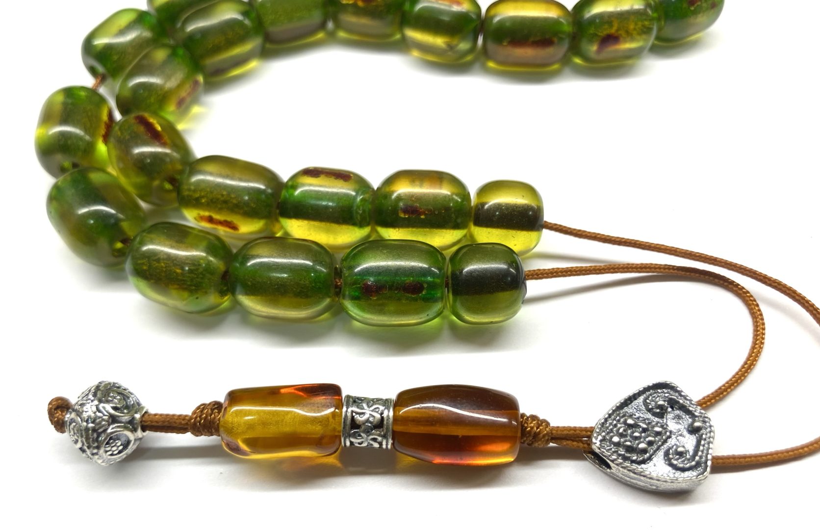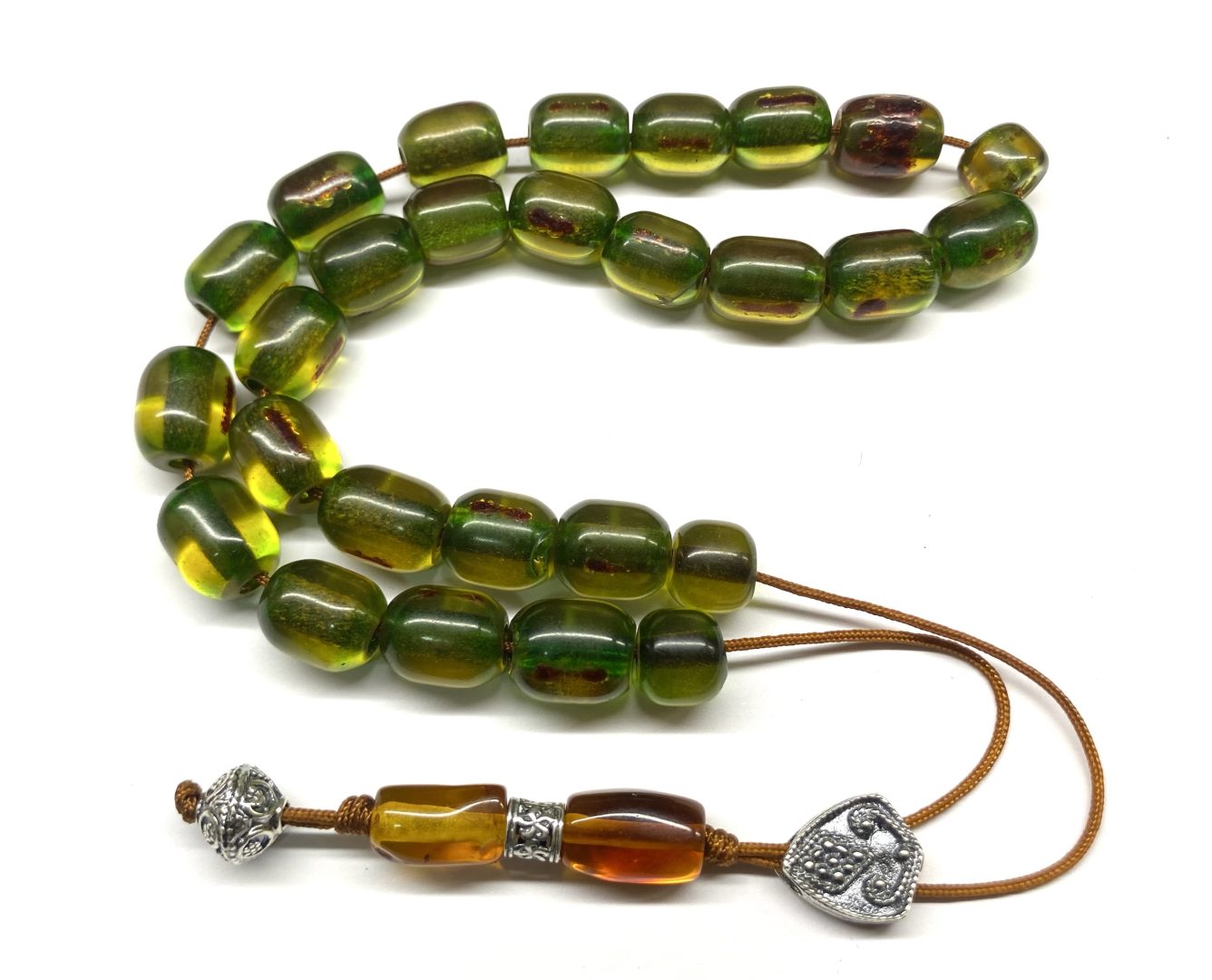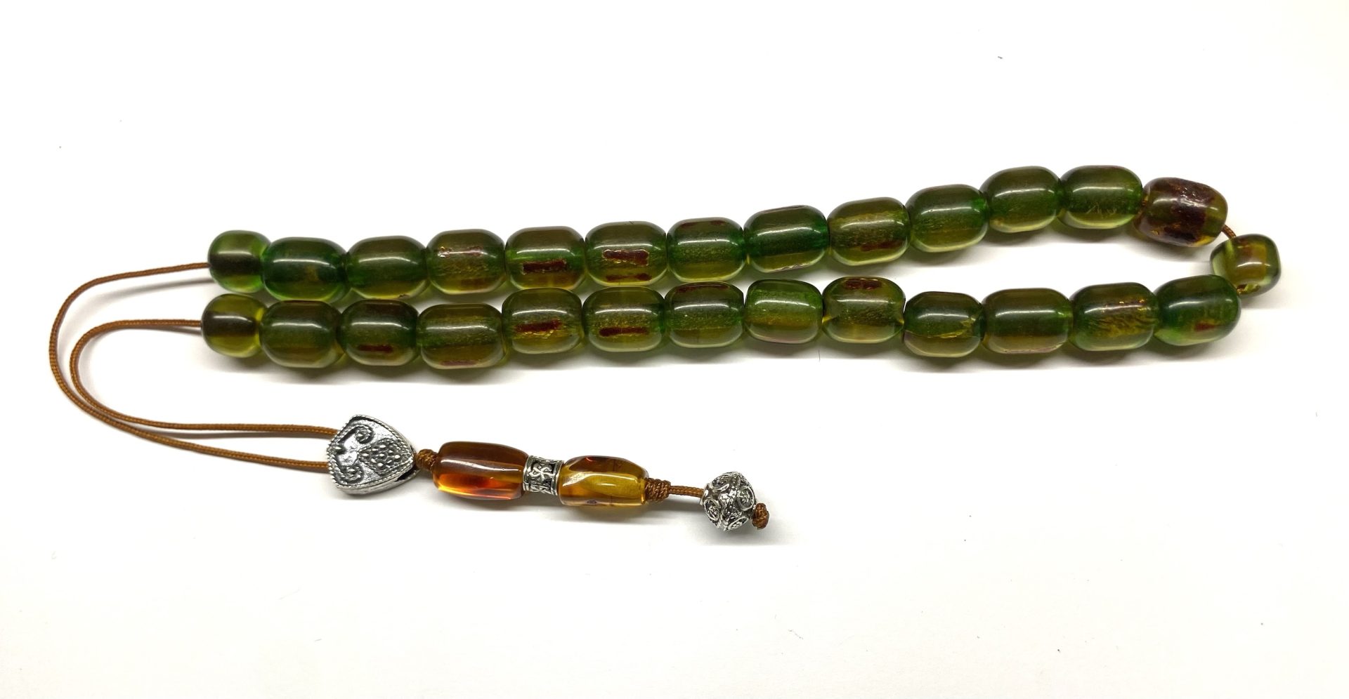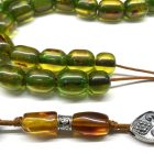 Χειροποίητο σπάνιο κομπολόι από παλαιά Μαστίχα Αιγύπτου σε χρώμα λάδί μελί και στο τελείωμα του κομπολογιού 2 χάντρες από ατόφιο Κεχριμπάρι Βαλτικής κονιάκ.
