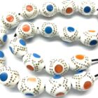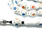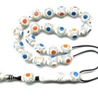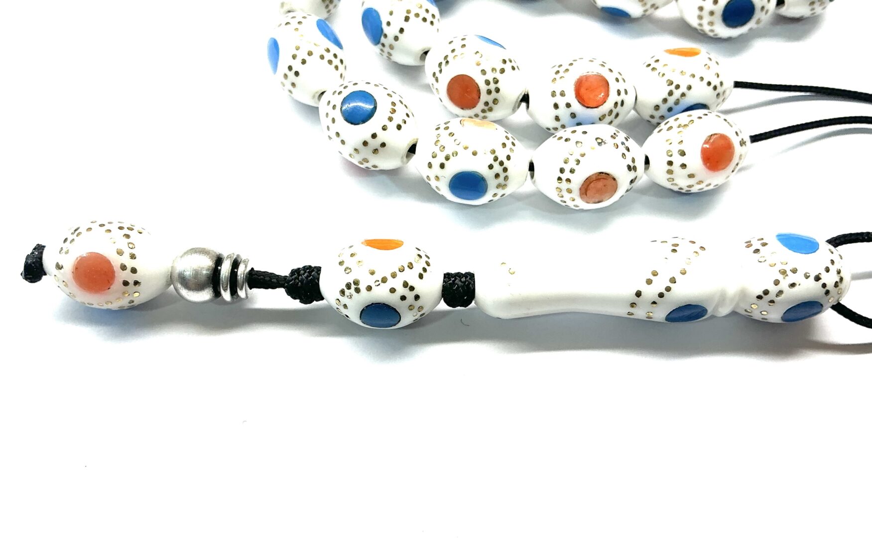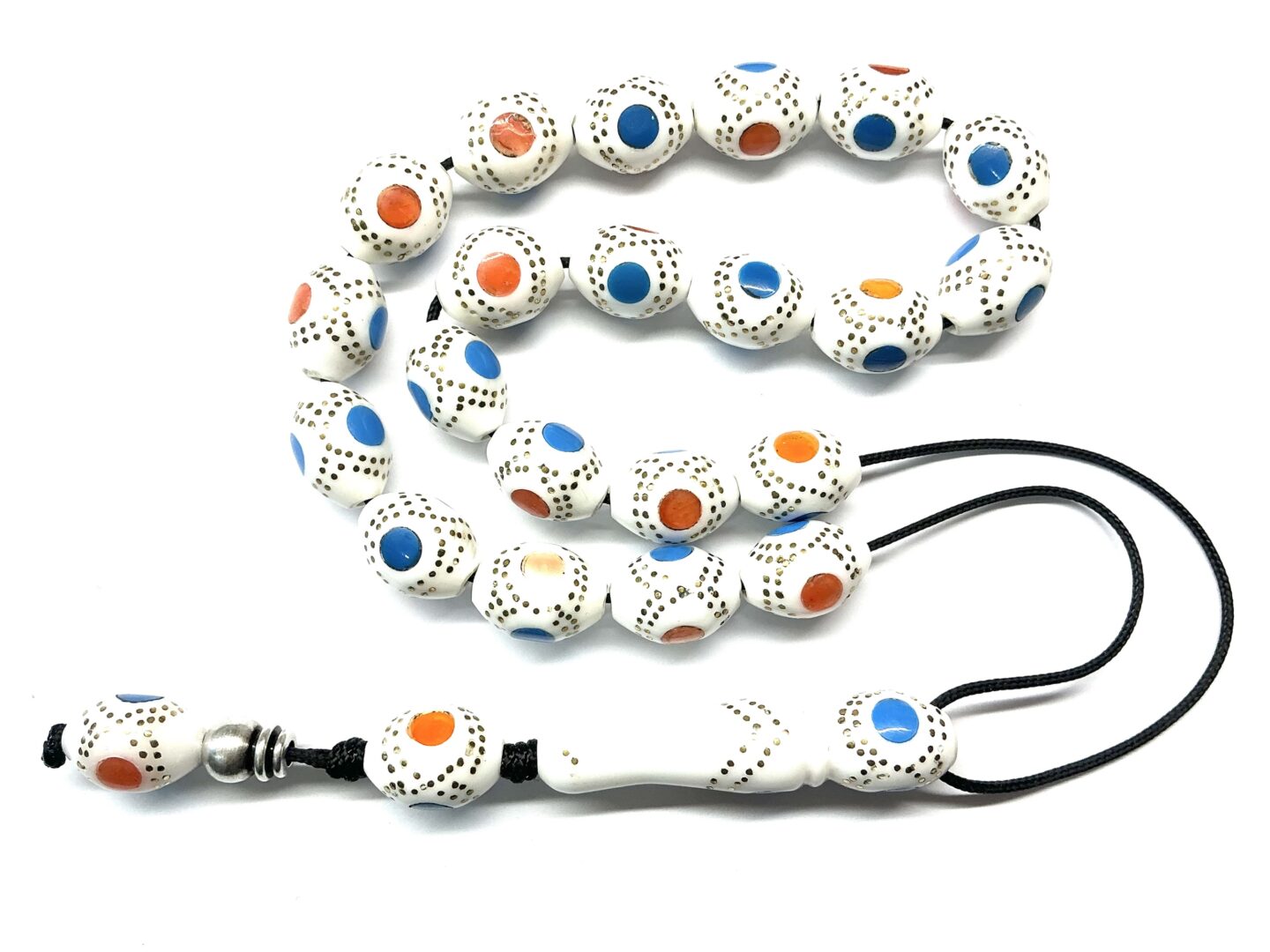 Χειροποίητο κομπολόι από Βακελίτη λευκό ( απομίμηση κόκκαλου ) σε σχήμα ελιά κεντημένος με μπρούντζο, μπλε και πορτοκαλί πάστα.