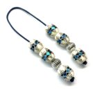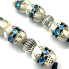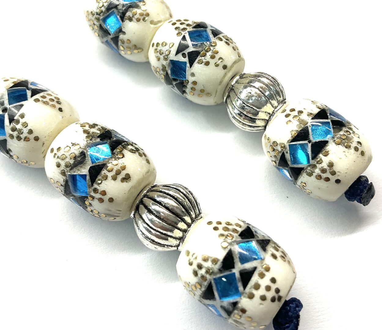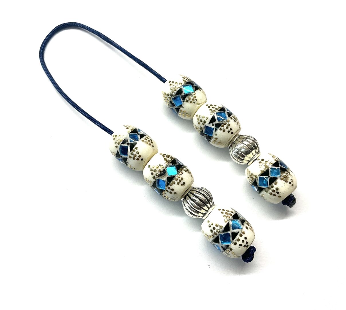 Χειροποίητο μπεγλέρι από κόκκαλο καμήλας σε σχήμα βαρελάκι στολισμένο με ένθετα από μπλε και μαύρη πάστα και καρφωμένο μπρούτζο.