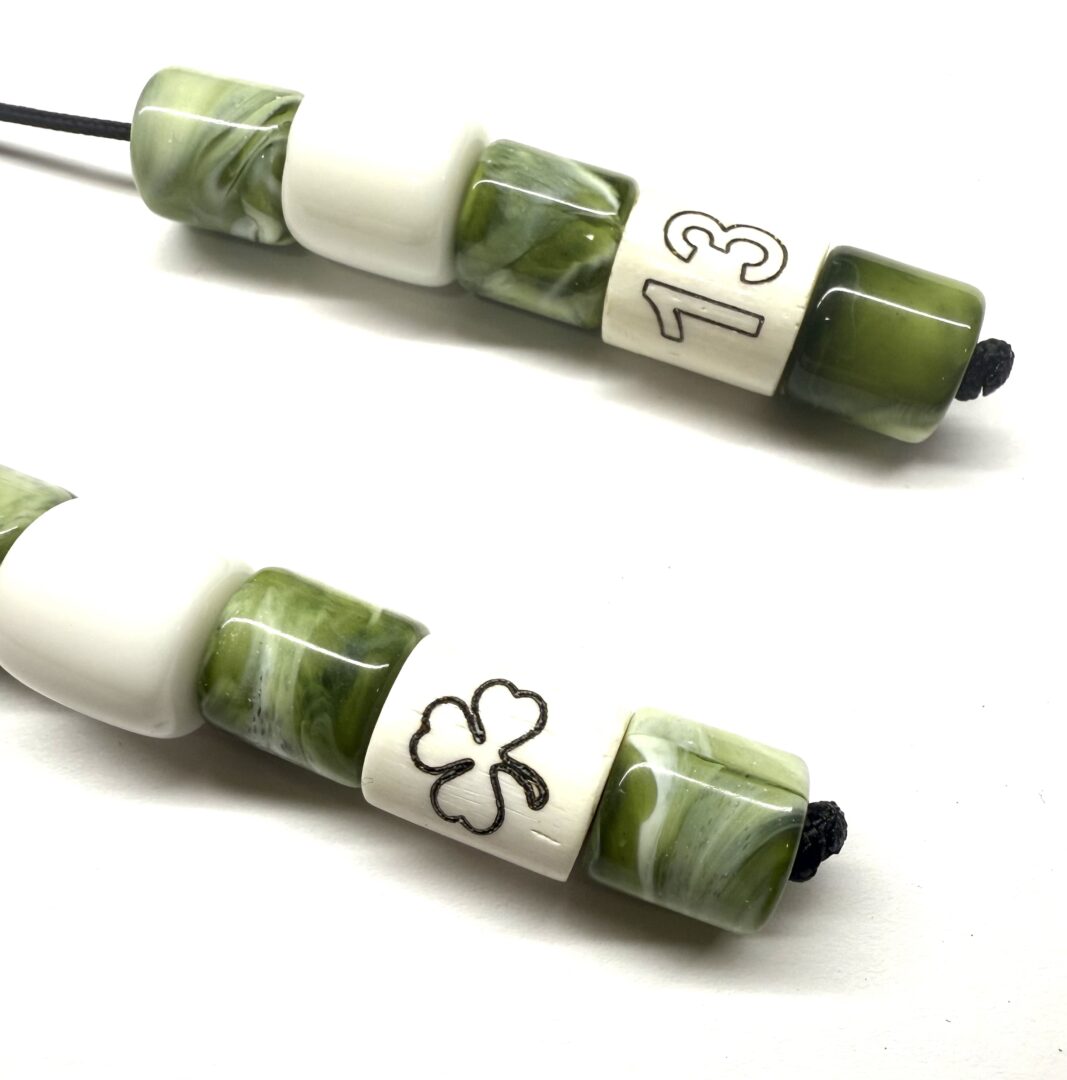 Χειροποίητο μπεγλέρι από ρητίνη και κόκκαλο καμήλας χαραγμένο με το σήμα του Παναθηναϊκού , δεμένο με 10 χάντρες .